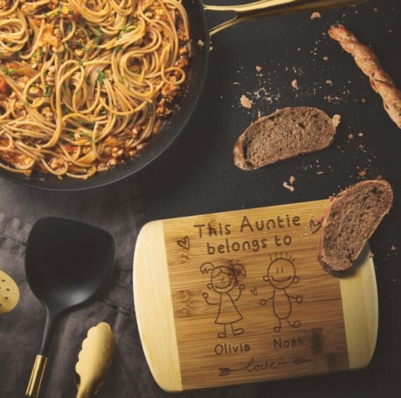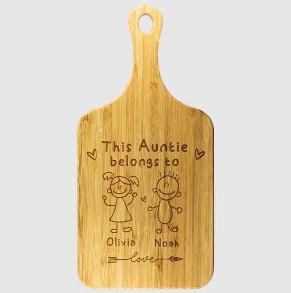 Crafted with precision from sturdy maple wood, each cutting board boasts its own unique wood grain patterns, reflecting the individuality of the woman it celebrates. Customize your gift with the names of your aunt’s precious joys – her nieces and nephews. Every time she uses this cutting board, she’ll be reminded of the special bond she shares with each one of them.