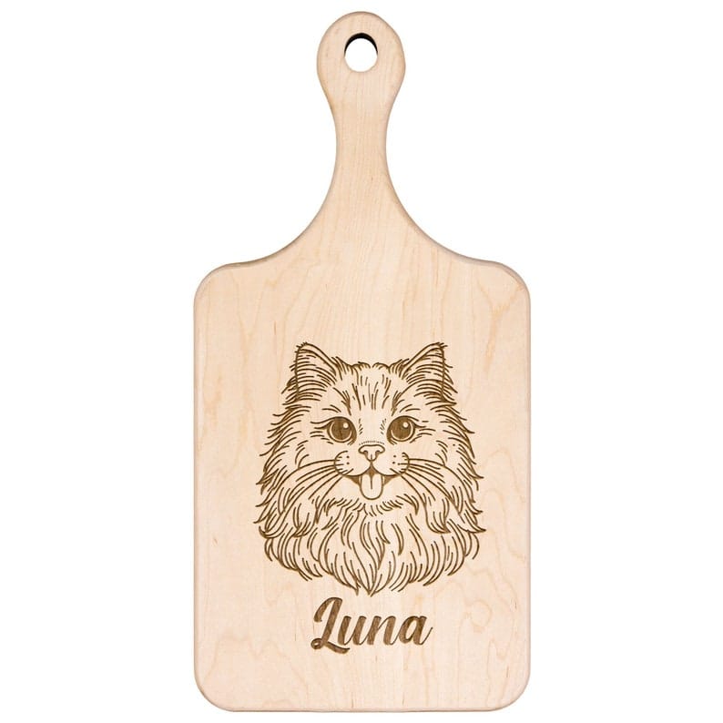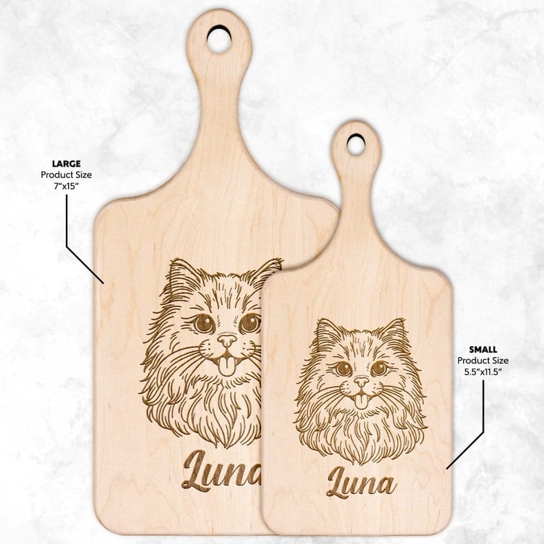 Capture the essence of your cherished cat and keep their memory alive with our Custom Cat Photo Engraved Wooden Paddle Cutting Board. Order yours today and cherish the memories forever.