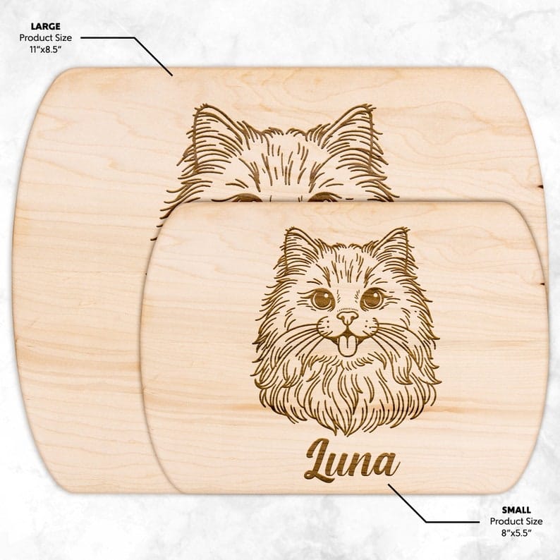 With our personalized cat portrait engraving service, you can immortalize your furry companion’s likeness on a durable wooden surface. Simply provide us with a photo of your cat, and we’ll expertly engrave it onto the cutting board with precision and care. Each detail of your cat’s unique features will be faithfully captured, ensuring a truly one-of-a-kind keepsake.
