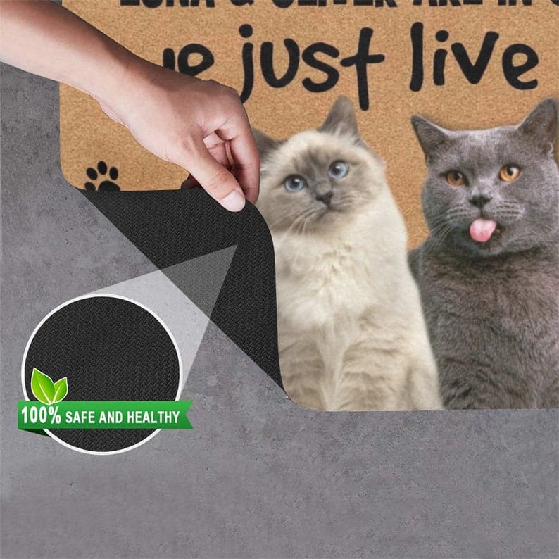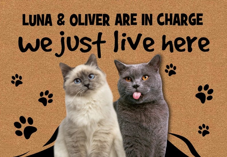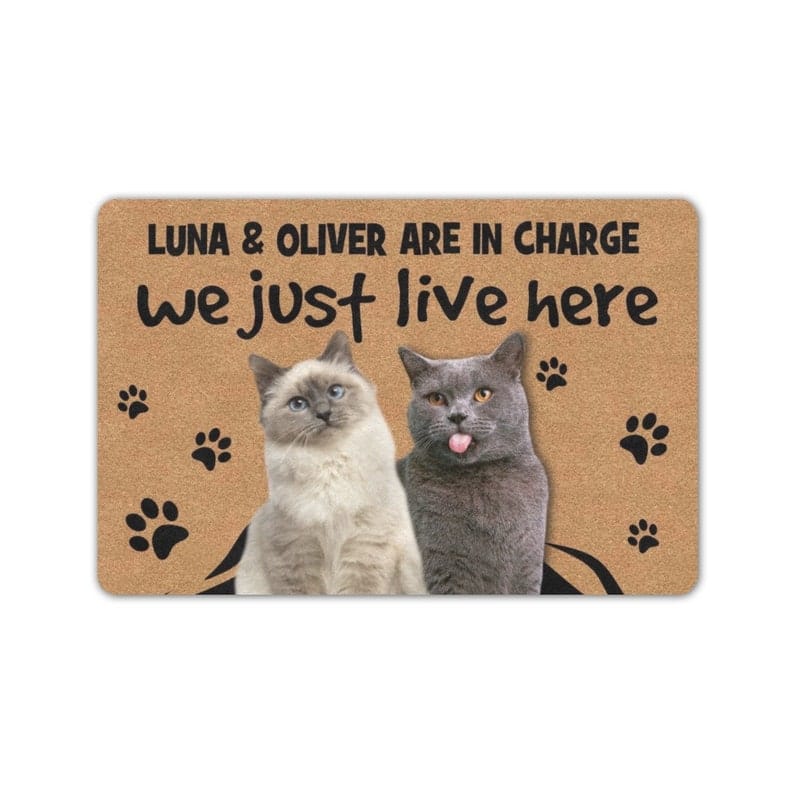 Introducing our delightful custom funny cat doormat, the ultimate gift for any feline enthusiast! This unique doormat allows you to showcase your beloved cat’s picture and name, along with a witty quote that will bring a smile to everyone’s face: “Cats are in charge – We just live here.” Not only does it add a touch of personalized charm to your doorstep, but it also serves as a functional and stylish accessory for your home.