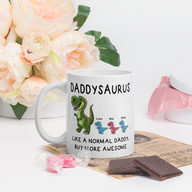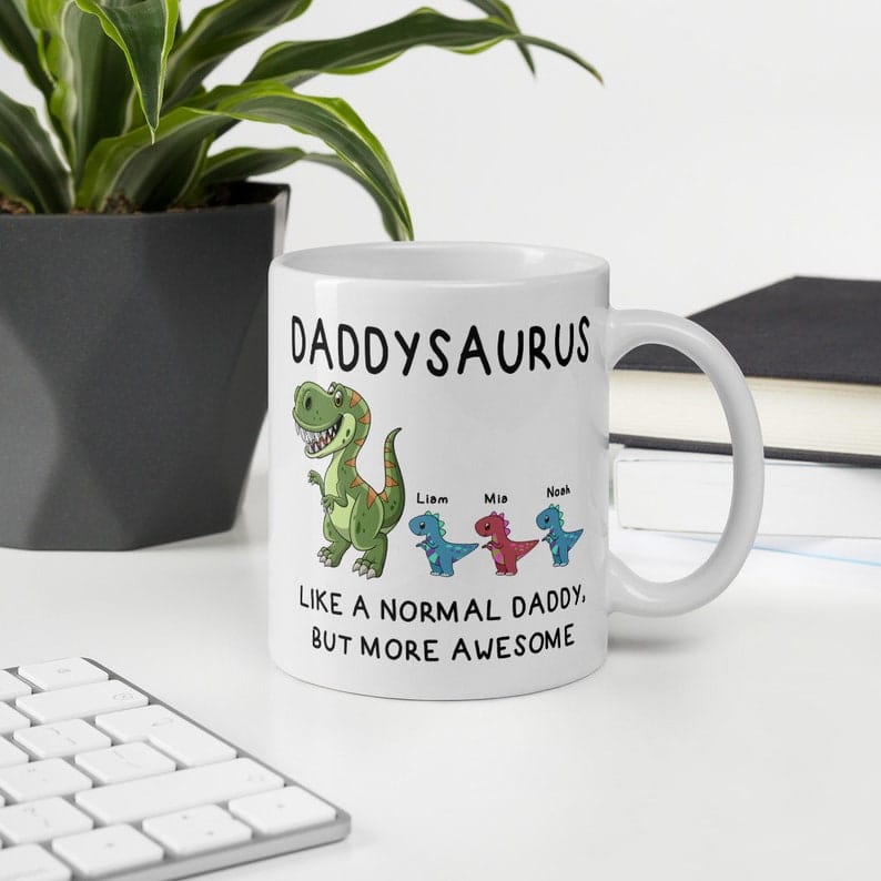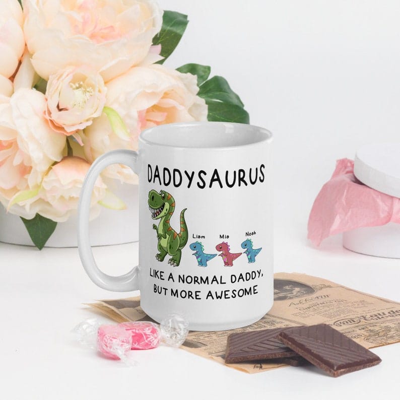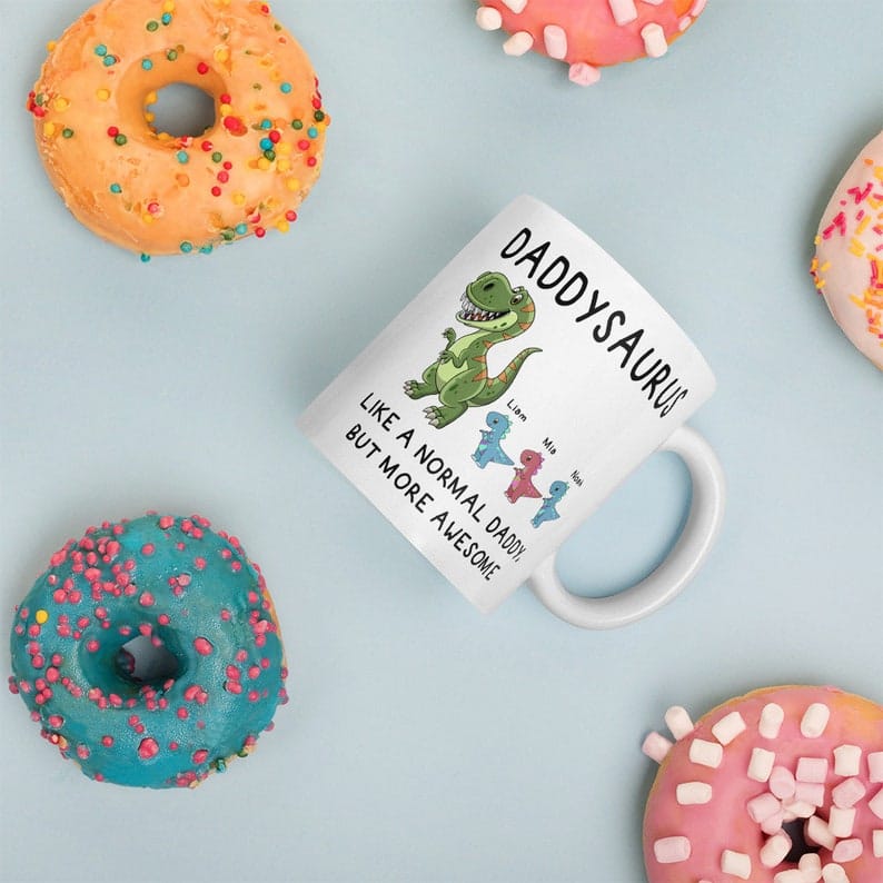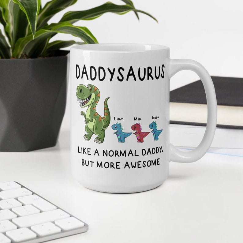 Daddysaurus with Baby Dinosaurs Coffee Mug is the perfect gift idea for all Fathers. Just send us the names of the kids and we will make this wonderful mug for you. We know from our own experience that every dad will be amazed! This personalized daddy coffee mug is a perfect gift idea for Father’s Day or Daddy’s Birthday.