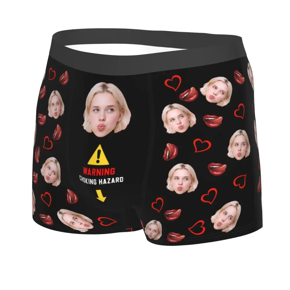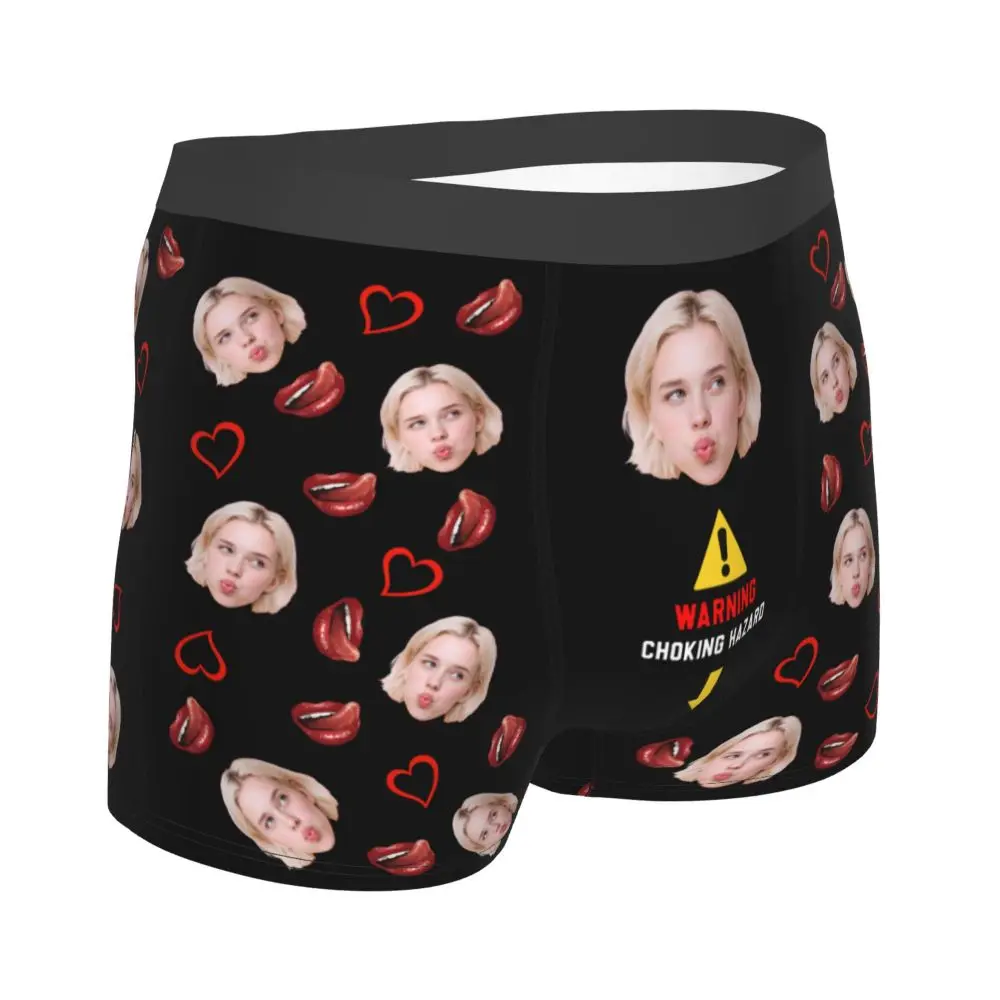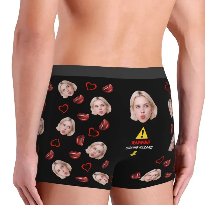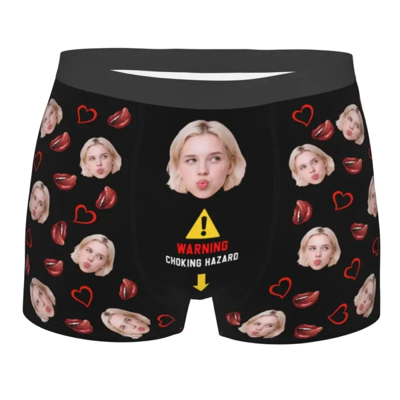 Make him laugh out loud with these hilarious choking hazard boxer briefs – the ultimate gag gift for men who love bold humor. Featuring a custom face print, red hearts, and a cheeky warning sign, these novelty underwear are perfect for Valentine’s Day, anniversaries, bachelor parties, or just spicing up date night. Designed for prank lovers, couples with a sense of humor, and anyone looking to surprise their partner with something unforgettable. Soft, stretchy, and guaranteed to start conversations.