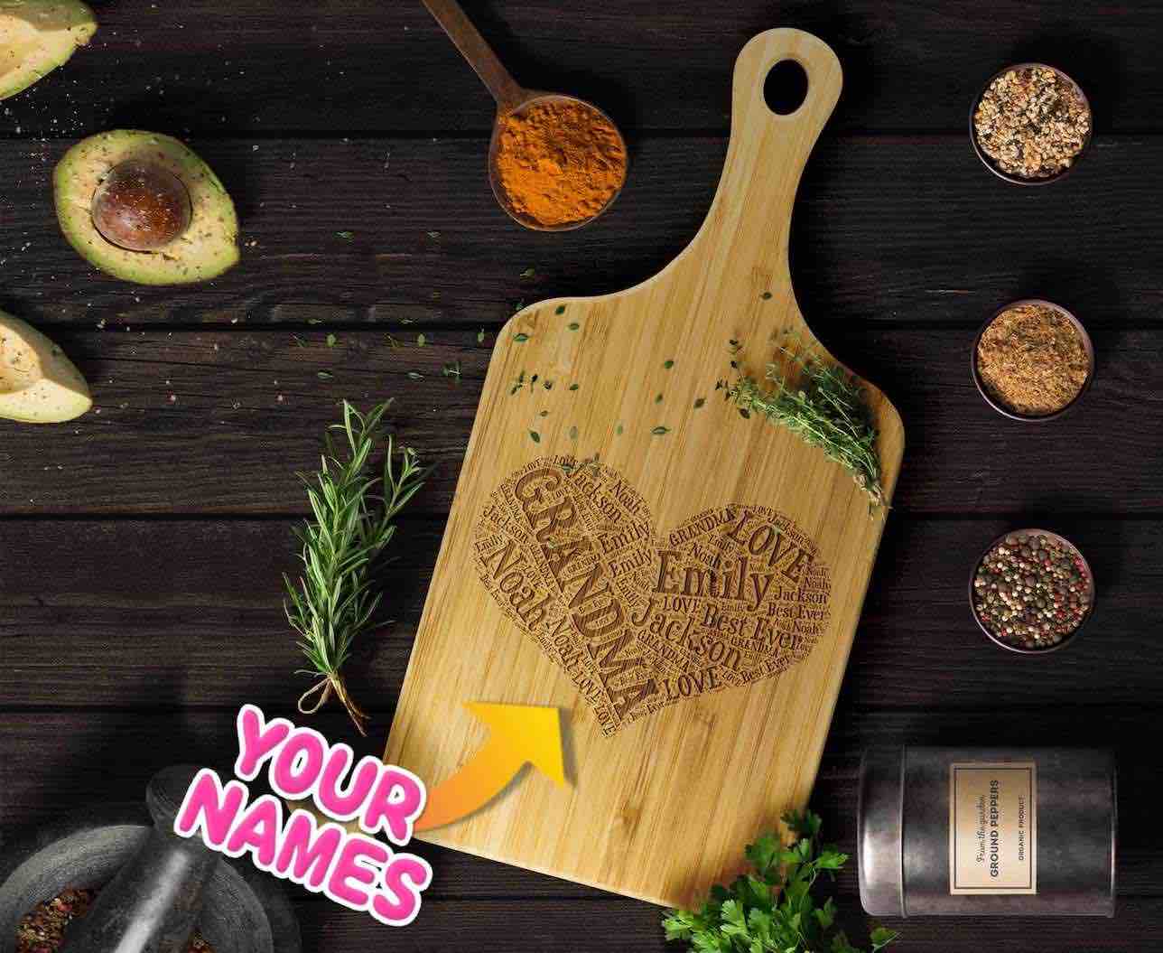 Surprise Grandma with a truly unforgettable Mother’s Day gift – a Personalized Heart-Shaped Cutting Board adorned with her grandchildren’s names. It’s more than just a gift; it’s a heartfelt expression of your love and appreciation for the grandmother who means the world to you.