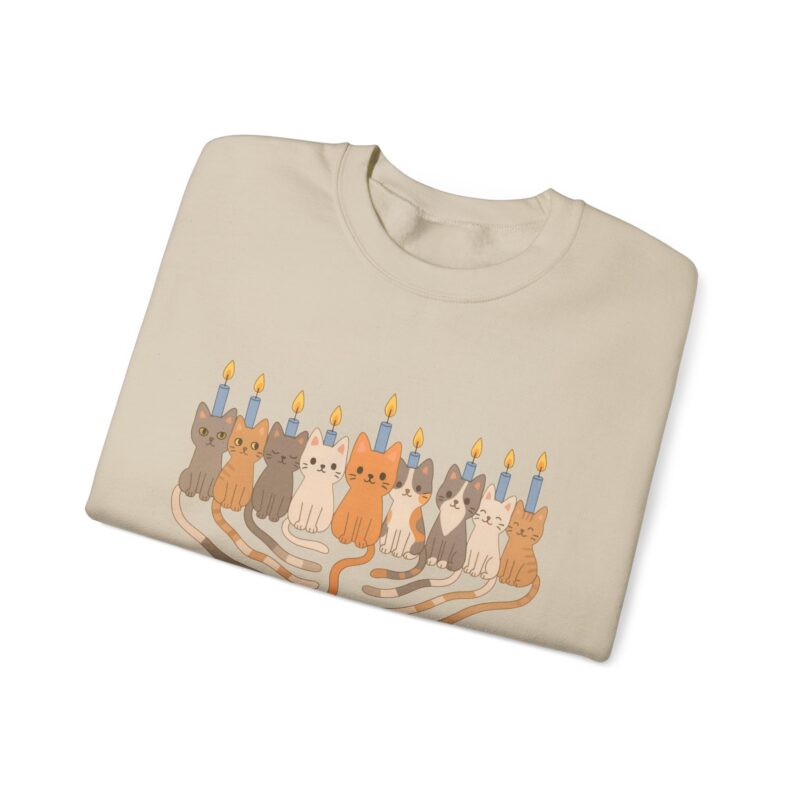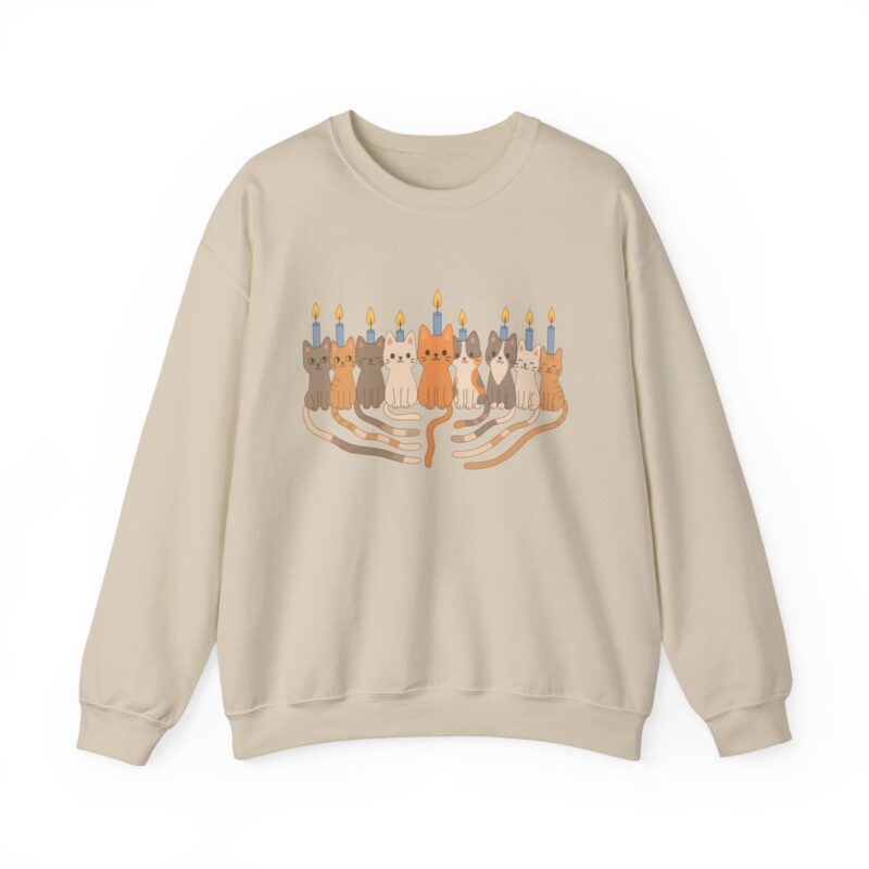 Crafted in cozy beige cotton blend, the sweatshirt features nine adorable cartoon-style cats arranged as a menorah, each with a glowing candle above their head. Their playful tails form the base, making it a charming twist on traditional Hanukkah symbols. Perfect for cat moms, Hanukkah families, and anyone who loves quirky holiday fashion.