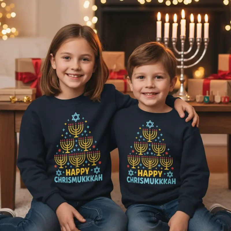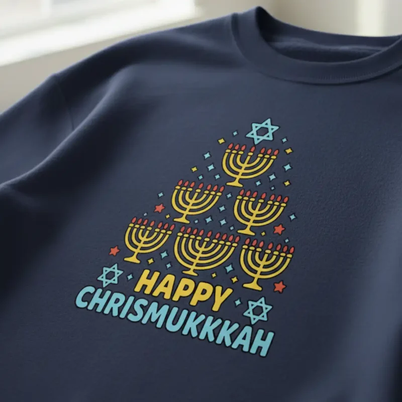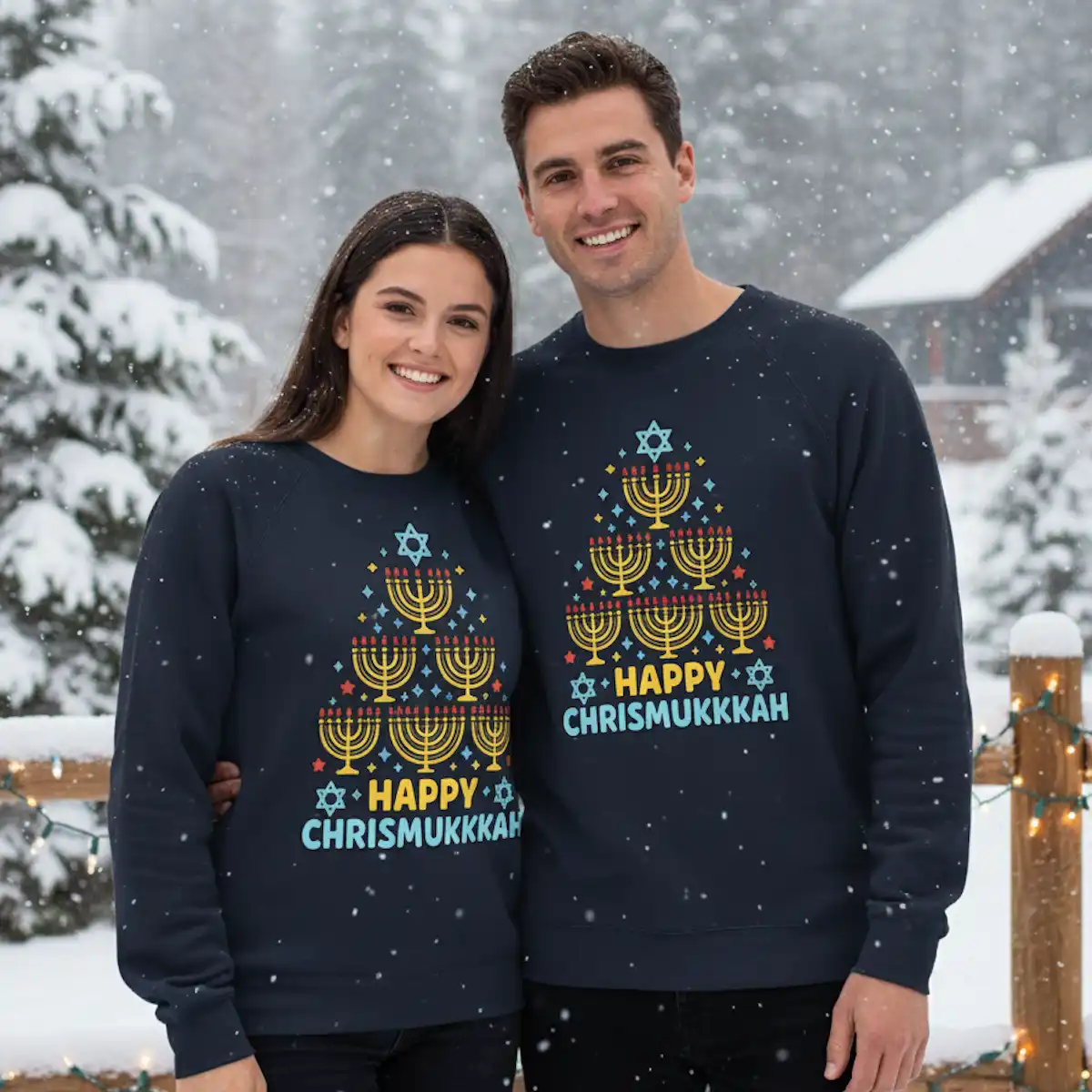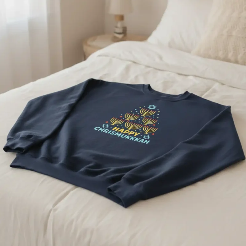 Celebrate both Hanukkah and Christmas with this cozy navy sweatshirt featuring a festive tree made of menorahs. The colorful candles, Stars of David, and playful design make it perfect for Chrismukkah parties, family gatherings, or casual winter wear. \n\nMade for Jewish families who love blending traditions, this sweater solves the holiday outfit dilemma with humor and warmth. Great for December events, gift exchanges, and anyone who wants to show off their dual heritage with pride.