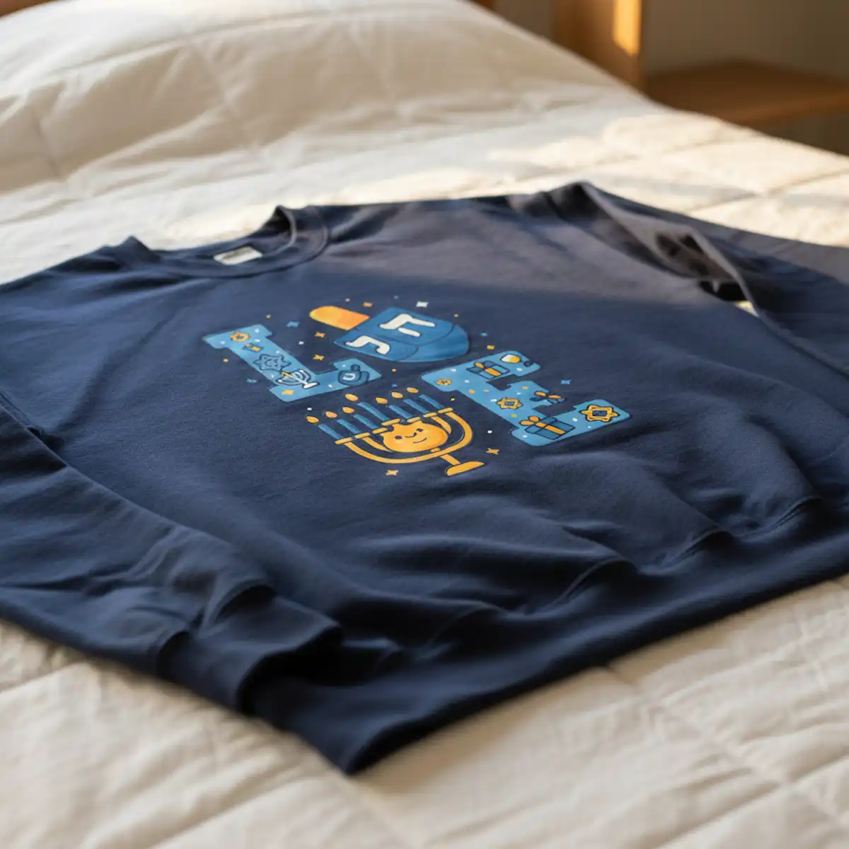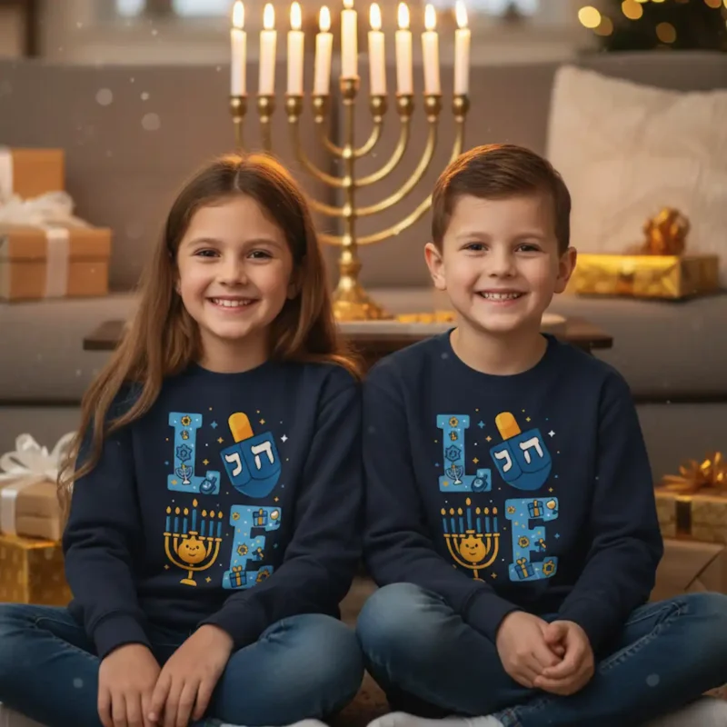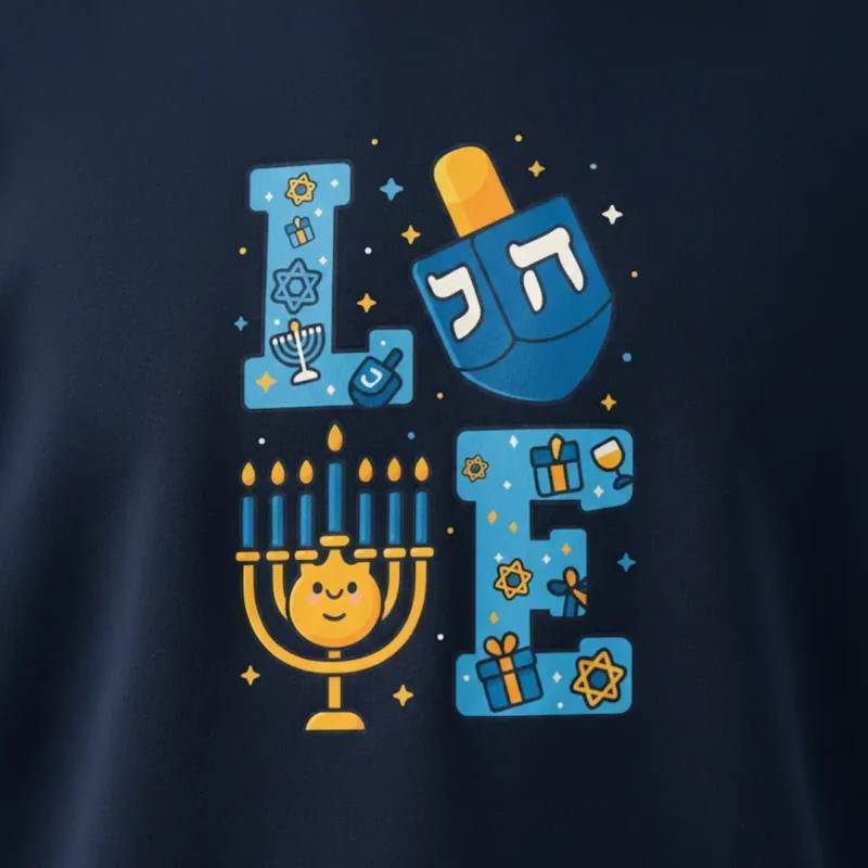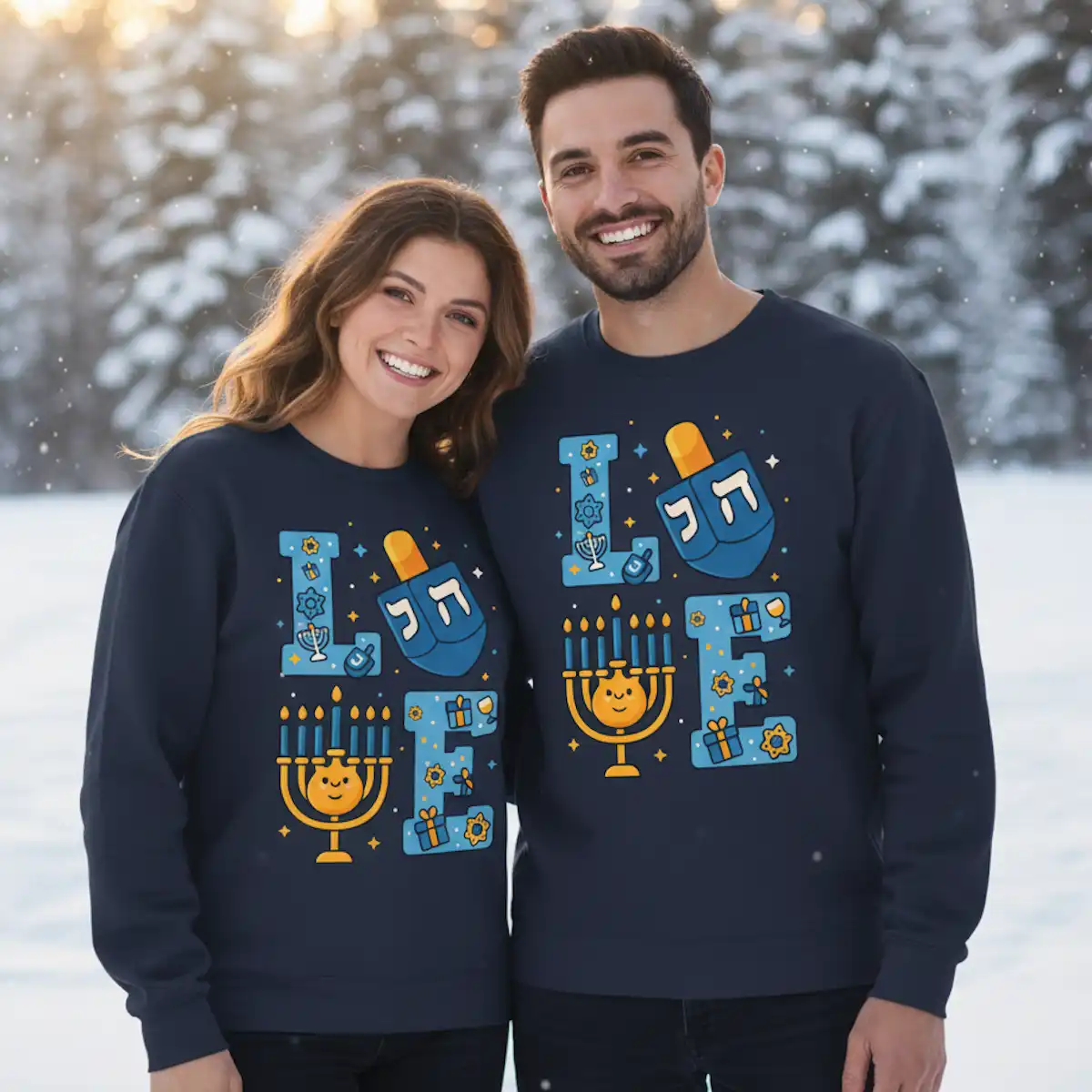 This Hanukkah LOVE sweater blends tradition and joy with a playful design featuring a Star of David, smiling menorah, dreidels, and festive gifts. Made for Hanukkah families, Hanukkah lovers, and anyone celebrating the Festival of Lights, it brings warmth and smiles to holiday gatherings, gift exchanges, and themed parties. Soft, cozy, and eye-catching, it solves the “what to wear” dilemma for Hanukkah events and makes a thoughtful seasonal gift.