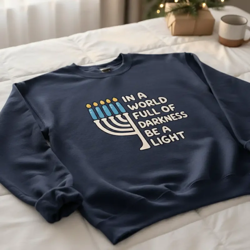 Celebrate Hanukkah with this Menorah Art Sweater featuring a bold inspirational Jewish quote. Designed with a detailed menorah graphic, it brings warmth and meaning to your holiday wardrobe. Made from soft fabric, it keeps you comfortable while showing pride in tradition. Perfect for Jewish families, holiday gatherings, and festive events, this sweater adds joy and cultural connection to every celebration. Whether worn at home, synagogue, or community parties, it highlights your faith and style with a unique design that stands out.
