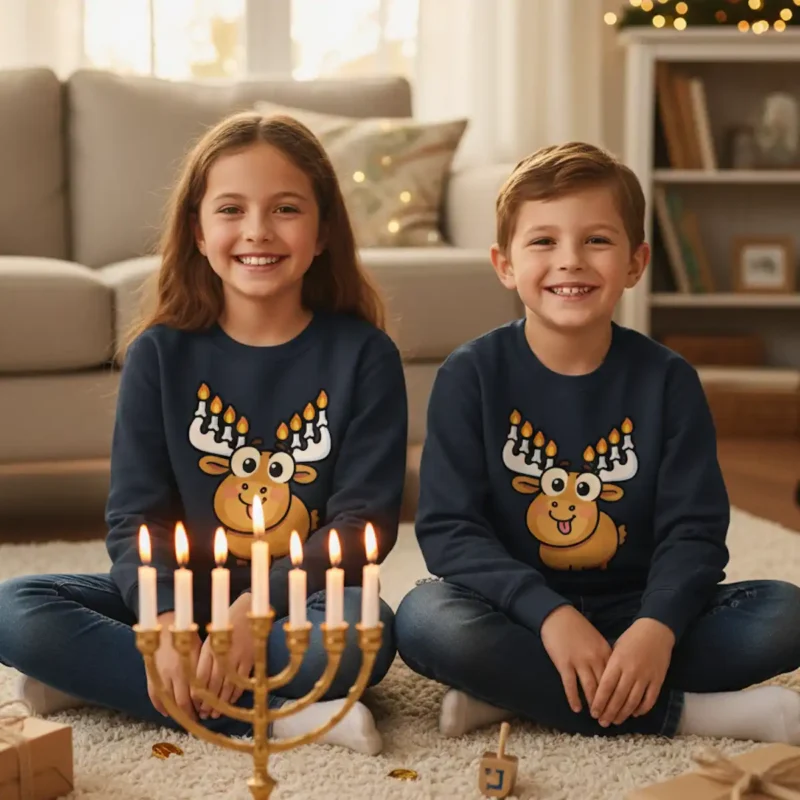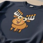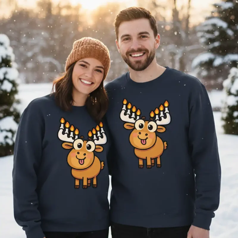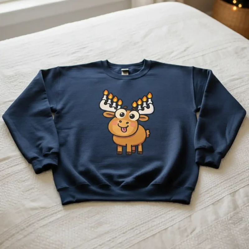 Funny Hanukkah sweater with cartoon moose and menorah antlers – perfect for Hanukkah holiday fans.