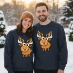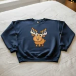 Celebrate Hanukkah with this cozy navy sweatshirt featuring a cartoon moose with menorah antlers and nine lit candles. The playful design blends Hanukkah tradition with holiday humor, making it perfect for family gatherings, festive parties, or casual winter wear. \n Made for Hanukkah families, Hanukkah lovers, and anyone who enjoys lighthearted holiday apparel. Soft cotton blend keeps you warm while spreading smiles. Great gift for kids, adults, and moose fans alike.