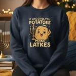 Celebrate Hanukkah with laughter and warmth in this cozy navy sweatshirt featuring a smiling cartoon potato wearing a kippah, holding up one finger next to a menorah. The bold text reads “If Life Gives You Potatoes Make Latkes,” making it perfect for latke lovers and Jewish humor fans.