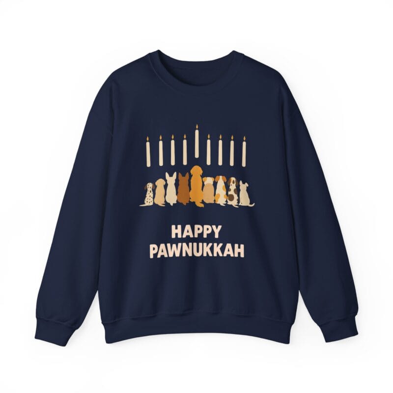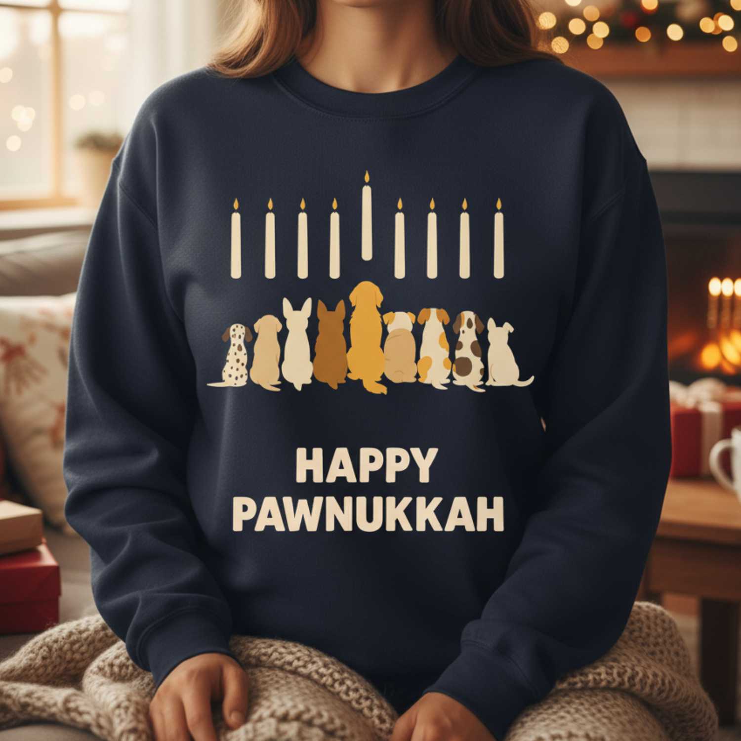 Celebrate Hanukkah with laughter and loyalty. This Happy Pawnukkah Funny Hanukkah Sweater with Dogs is the perfect blend of festive spirit and canine charm. Featuring nine adorable dog silhouettes as menorah candles, it’s a heartwarming tribute to Jewish dog owners who love humor and tradition.