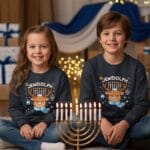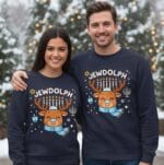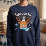 This Jewdolph Hanukkah sweater features a cartoon reindeer with a blue nose, striped scarf, and menorah antlers. It’s perfect for Jewish holiday lovers who want to celebrate Hanukkah with humor and warmth. The navy blue sweatshirt includes festive icons like the Star of David, dreidel, and candles, making it ideal for parties, family gatherings, and gift exchanges. Made for Jewish families, holiday fans, and anyone who enjoys playful designs with cultural flair. Soft, cozy, and designed to spark smiles during the Festival of Lights.