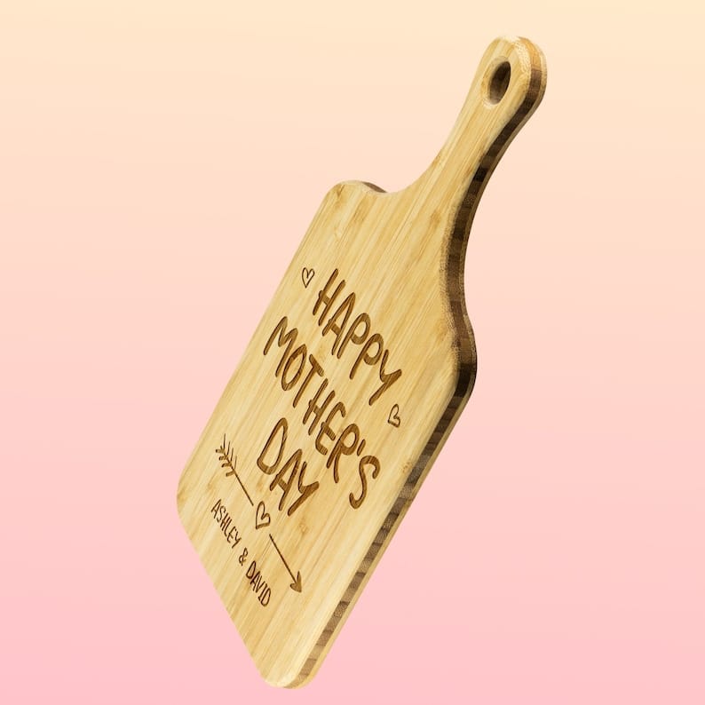 Imagine the joy on Mom’s face when she sees her children’s names beautifully etched onto this durable maple wood cutting board. It’s a touching gesture that will warm her heart with every use.