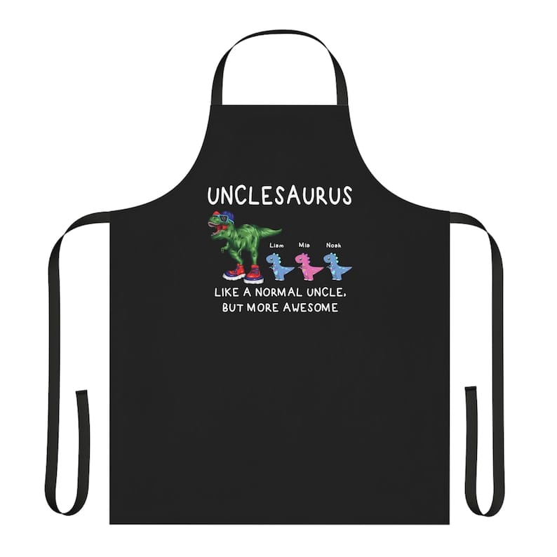 Looking for a unique gift for your favorite uncle? Introducing our Unclesaurus Apron, the perfect personalized dino lover gift for Uncle’s Day! This custom apron features a T-Rex uncle surrounded by adorable baby dinosaurs, personalized with your kids’ names. It’s like a normal uncle apron, but way more awesome!
