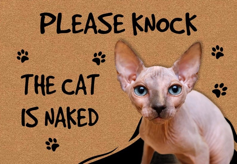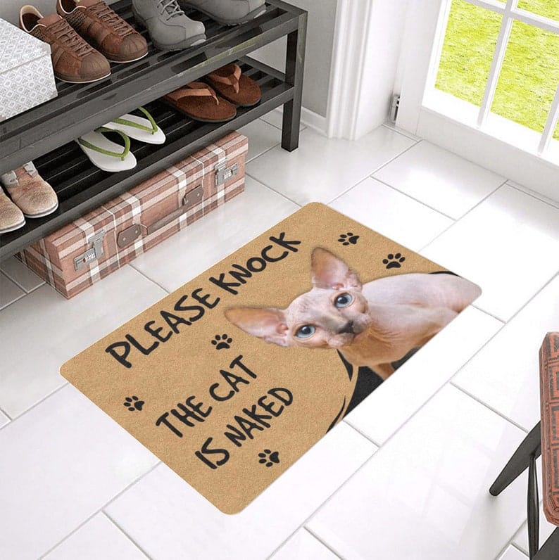 The Personalized Sphynx Cat Doormat is a funny personalized cat doormat and custom pet welcome mat that makes the perfect Sphynx cat lover gift. With its cheeky “Please Knock, The Cat is Naked” design, this novelty cat home decor piece is a must-have personalized holiday gift for hairless cat owners and pet parents who love to laugh.