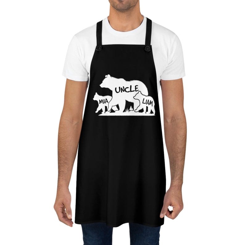 This custom uncle’s apron is more than kitchen gear—it’s a meaningful symbol of family love and the special role uncles play in children’s lives. The elegant black apron showcases charming bear silhouettes that represent Uncle and his precious cubs, with each nephew’s and niece’s name beautifully displayed on the smaller bears. Perfect for Uncle’s Day, birthdays, Father’s Day, Christmas, or any occasion when you want to honor an amazing uncle. Premium black fabric creates a striking backdrop for the bear design, while high-quality materials ensure this keepsake apron lasts through countless grilling sessions and family gatherings.