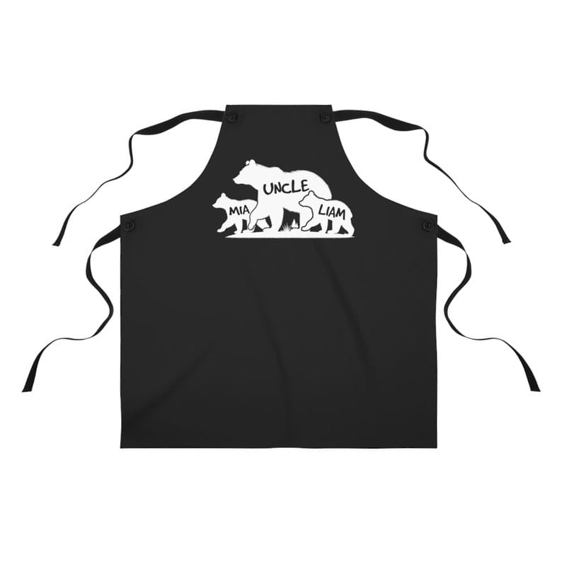 Honor the special uncle bear in your family with this touching personalized uncle bear apron featuring beautiful bear silhouettes and customized nephew and niece names. The heartwarming design shows a large bear labeled “Uncle” alongside smaller bear cubs personalized with each child’s name, celebrating the unique bond between uncle and his little sidekicks.