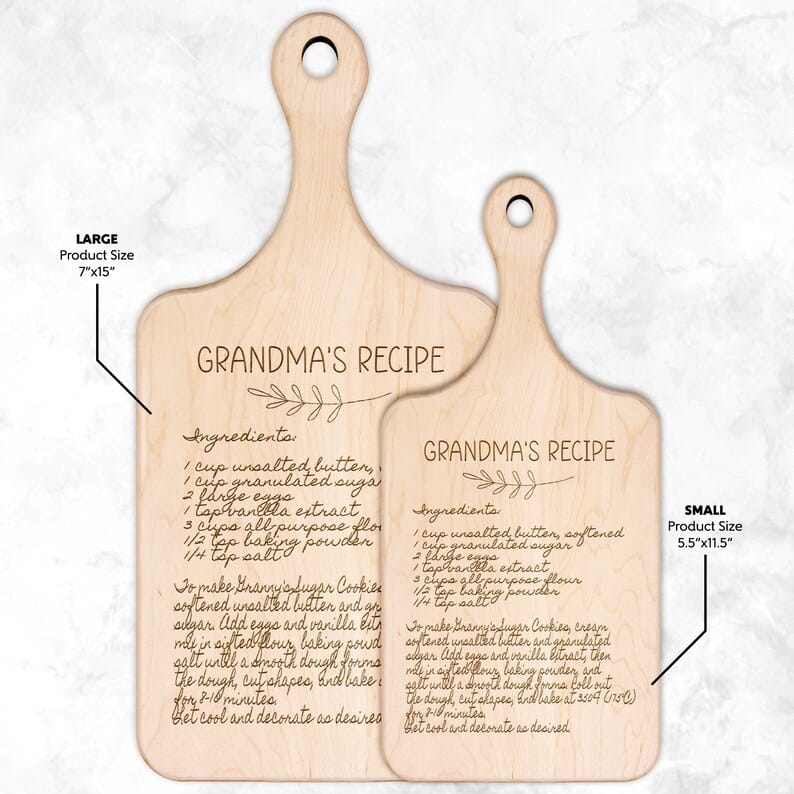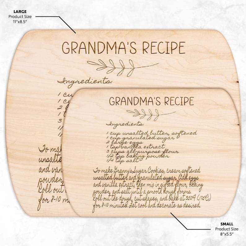 Not just for Mother’s Day, our Grandma’s Handwritten Recipe Cutting Board makes a thoughtful gift for birthdays, anniversaries, housewarmings, or any special occasion. Its practicality combined with the personal touch of a cherished family recipe makes it a versatile and meaningful present for anyone who values the bond of family and the joy of home-cooked meals.