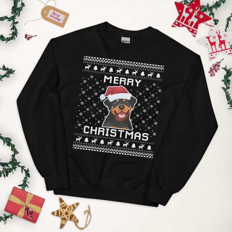 - Festive sweatshirt graphic of a Rottweiler (Rottie) wearing a Santa hat with Christmas elements