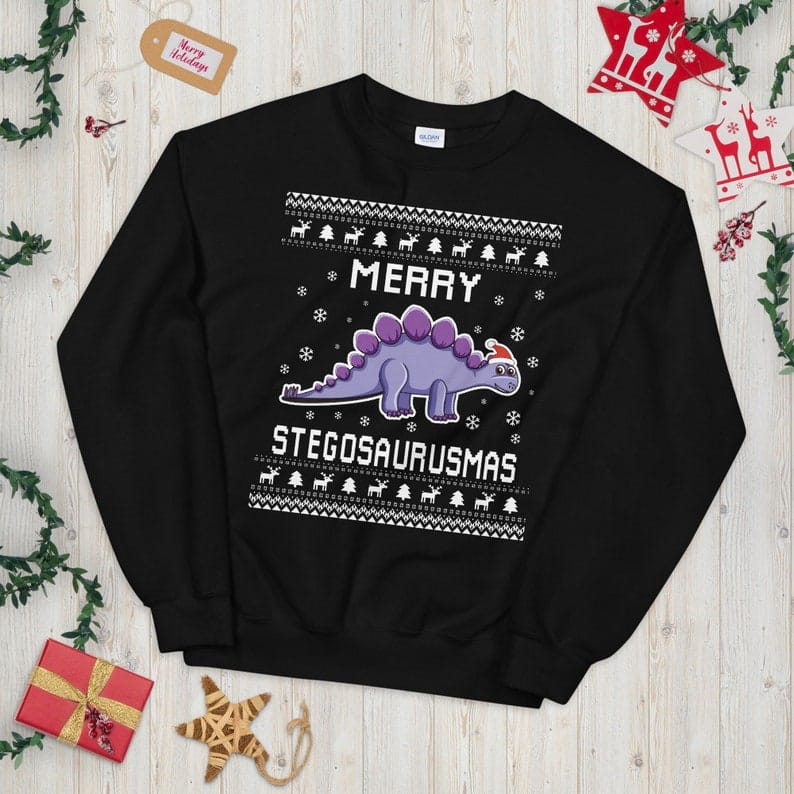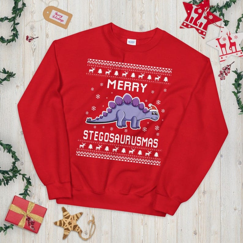 Stegosaurus Ugly Christmas Sweater adds festive dinosaur fun and makes the perfect holiday gift idea for dino lovers, families, and office party outfits.