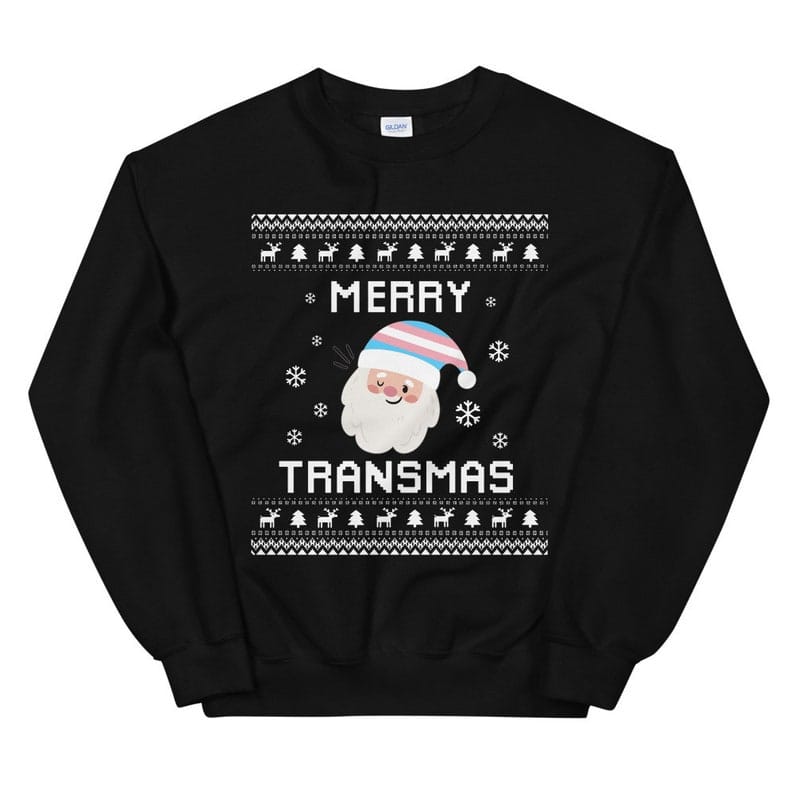 • Sweatshirt design features a festive Trans pride graphic with Santa hat and Christmas elements